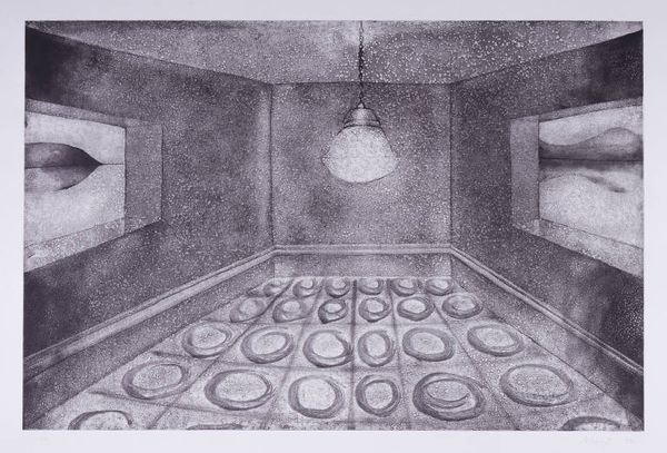 Editor: Here we have Richard Artschwager’s "Door, Mirror, Table, Basket, Rug, Window" from 1975. It's an etching, rendered in simple black and white, showing… well, exactly what the title suggests! I'm struck by the overall… flatness of the space, despite the attempts at perspective. It feels strangely unreal. What do you make of it? Curator: It's a visual paradox, isn’t it? Artschwager throws all these domestic objects – door, mirror, the whole shebang – into a seemingly familiar setting, but the etching technique, that all-over texture, disrupts any sense of depth or realism. He's winking at us, nudging us to question what we consider “real” representation. Is it a room or just a collection of familiar forms, barely held together by our expectations? Editor: So it's about playing with perception? Like a visual puzzle? Curator: Precisely! Think about how we piece together the world around us – fragments, glimpses, tactile experiences. Artschwager gives us only fragments, roughly hewn, denying us the illusion of a seamless reality. The mirror, which should reflect, feels as solid as the door! Isn't it funny? He transforms the familiar into the uncanny. Editor: I see! It's almost like he's deconstructing the idea of "home." So, minimalism meets… the Twilight Zone? Curator: (chuckles) A delightful analogy! Perhaps he is questioning whether minimalism has something, somehow monstrous at its foundations.. Maybe the bland reality is hiding something terrifying or bizarre about a very ordinary thing. That's one way of putting it! He prompts us to re-evaluate our relationship with the everyday objects we often take for granted. Editor: That makes me see the work completely differently! It’s no longer just a flat image, but a commentary on how we perceive space and objects. Thank you! Curator: My pleasure! It's a testament to Artschwager's skill that he can elicit such a layered response from such a seemingly simple etching. It leaves us wondering, what other illusions are we living under, surrounded by doors and windows?