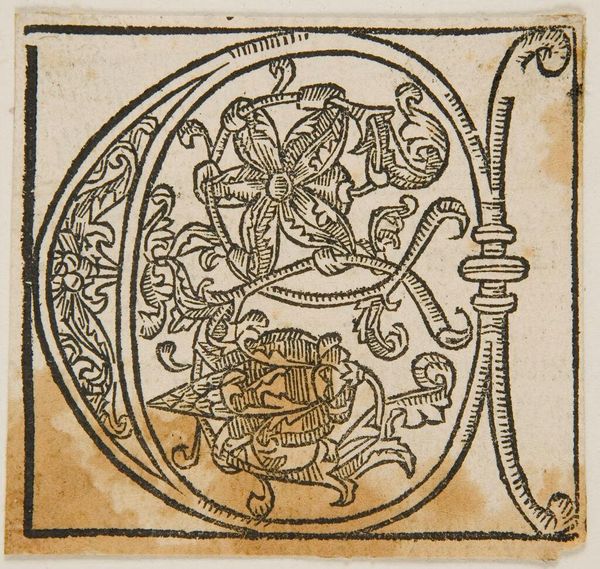Curator: Here we have a small but captivating print titled "Letter P," crafted by an anonymous artist. The intricate woodcut reveals a letter 'P' intertwined with foliage and decorative elements. Editor: It has such a dense, almost claustrophobic feel. The heavy black lines against the stark white give it an intense graphic quality. Curator: The density you mention creates a fascinating interplay of positive and negative space. The letterform itself is quite stylized, almost anthropomorphic in its curves. Editor: Perhaps this density reflects the limited access to literacy of the period? The letter becoming not just a signifier but a precious, almost sacred object? Who might have had access to such materials? Curator: That's a compelling consideration. The materiality of the woodcut, the deliberate carving, enhances the visual impact of the letter itself, drawing us into its form. Editor: A stark reminder that even the alphabet carries histories of power and exclusion. Curator: Indeed, and analyzing the form allows us to consider the broader social implications embedded within this seemingly simple letter. A powerful statement, however small.
