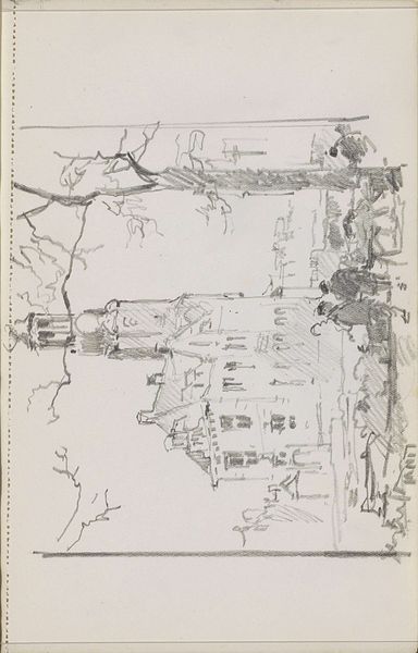 Curator: This delicate pencil drawing offers us a glimpse of Dutch urban life. The Rijksmuseum holds this sketch, “Rijtjeshuizen aan een gracht,” or “Row Houses on a Canal,” attributed to Cornelis Vreedenburgh and thought to have been created sometime between 1890 and 1946. Editor: It’s quiet, isn't it? Almost ghostly. The soft pencil lines create this hazy atmosphere. The reflection in the canal gives it an almost surreal quality, as if we are seeing two worlds superimposed. Curator: It certainly captures a fleeting moment. Vreedenburgh was known for his cityscapes, often depicting Amsterdam and other Dutch towns. His choice of rendering in pencil emphasizes a sort of temporal reality, fleeting. The choice resonates powerfully, perhaps to echo a time that will also fade, will reflect and decay. Editor: I wonder about that reflection...what did canals and rivers symbolize during that time period? It's almost as though it presents a different perspective of societal reality versus lived expectations. Also, it's hard to avoid looking at the skeletal tree in the sketch, it gives it almost an ominous, dark feel despite the calm, pastel rendering. Curator: Water, often depicted as a feminine symbol, suggests potential change or the natural flow, especially within art created during the period that saw great technological advances that uprooted so much social continuity. In light of those major socio-historical shifts, Vreedenburgh shows the canals to provide life. And perhaps, in concert, death. As for the tree you pointed out... the skeletal nature makes us consider ideas of cyclical realities; birth, life, death, renewal. That makes the artwork even more potent with multiple layers of symbolism in a drawing about architecture and social places. Editor: You are right; the symbolism elevates this from just a simple cityscape to something more evocative. It invites the viewer to ponder their own relationship with their social environment and how reflections on time alter experiences, much like in reality itself. It also seems like a comment on memory. Curator: Precisely, and that kind of introspection becomes even more crucial when one thinks about its artistic choices. Its simplicity emphasizes the psychological dimension that permeates seemingly placid streets of Holland. Editor: It makes one look at Dutch cityscapes with a completely new level of interest. Thank you for this conversation! Curator: My pleasure. Thank you for providing such compelling points on which to engage.