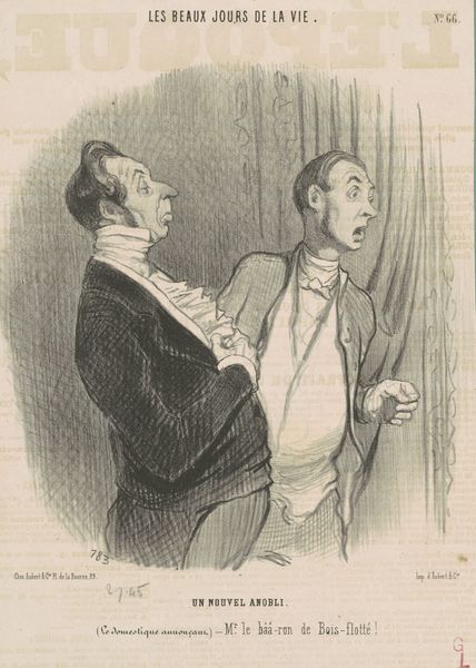 Honoré Daumier created this lithograph, titled "L'Inconvénient d'avoir un ami mélomane", which translates to "The Disadvantage of Having a Music-Loving Friend," during a time of significant social change in France. Daumier was a keen observer of Parisian life, and his art often reflects the everyday experiences of the bourgeoisie. This image captures a moment of excruciating, or perhaps comical, intimacy. We see a man completely absorbed in his song, oblivious to the obvious discomfort of his companion. The singer's dramatic pose and the discarded sheet music on the floor suggest a performance charged with emotion, yet the friend’s pained expression tells a different story. It’s a wonderful study of contrasts; passion versus polite tolerance. Daumier's work invites us to reflect on the nuances of social relationships and the ways in which personal passions can both unite and divide us. It touches on the tension between self-expression and social etiquette, reminding us that sometimes, the things we love most can be a source of annoyance to others.