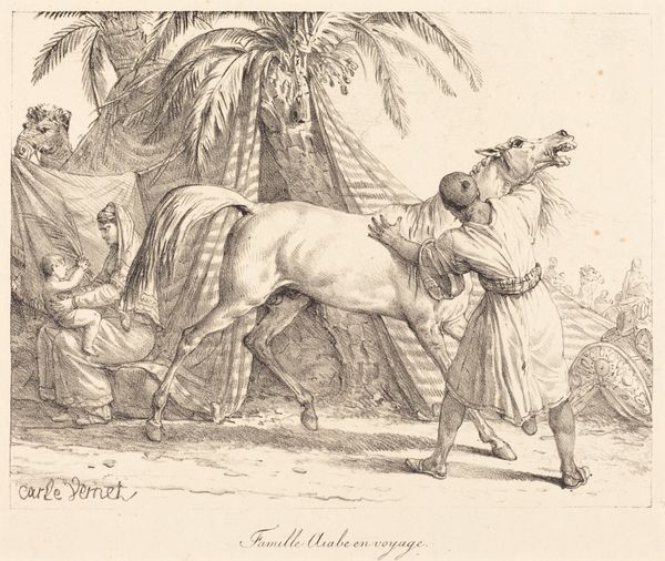 Curator: Here we have a print entitled "A Mameluck Resting" by Carle Vernet. Editor: There's such serenity in this scene. The delicate hatching technique of the printmaking lends a soft, almost dreamy quality to the rest and calm suggested in the scene before us. Curator: Vernet’s work here presents a glimpse into the genre of Orientalism, and considering the print medium is significant. Prints were far more accessible than paintings, enabling wider circulation of these romanticized depictions of the East. The engraving is so fine, nearly photorealistic. Editor: Absolutely, and the subject matter itself–a Mameluke, resting with his horse amidst a landscape with palm trees and glimpses of Middle Eastern architecture– speaks volumes. We’re presented with a potent symbol of both repose and readiness; this man is pausing, but his weapon and the fully saddled horse imply imminent action. Curator: And we have to think about the market for this kind of image. Prints like these were likely collected and traded, informing European ideas of the Orient. How much of that imagery shaped policy, attitudes to trade and even military planning? The layering of intention is palpable. Editor: Consider the turban, a symbol of cultural and religious identity, contrasted with the military accoutrements. The careful staging of the scene is clear. Every detail speaks not just of a man at rest but also of the power and the implied otherness of the 'Orient'. It’s almost a study in how signs and signifiers converge. Curator: The composition subtly hints at tensions, too. We see, through close looking, that the material reality – the method of dissemination, the social functions of prints like these – created and reinforced narratives about a distant and potentially threatening “other”. Editor: Looking closer then we’re actually prompted to ask what is being rested here? Is it the Mameluke, his horse, or the audience consuming an exotic and Orientalist depiction. The peace of the moment belies complex cultural dynamics at play. Curator: Exactly, prompting a deeper engagement with how this image and its material iterations played a role in constructing a cultural narrative. Editor: A final reflection then... The piece beautifully captures a fleeting moment while also symbolizing an ongoing complex interaction between cultures and their respective mythologies.
