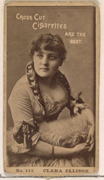 Curator: Let's discuss this card from Allen & Ginter’s "Actresses" series, dating between 1885 and 1893, featuring Charlotte Tittell. It's fascinating how these cards circulated as promotional items for Virginia Brights Cigarettes. Editor: My first impression is how strikingly modern the portrait feels. The soft focus and the direct gaze give it a real intimacy, despite its obviously commercial function. You almost forget it's trying to sell you something. Curator: Indeed. It reveals the rising status of actresses as public figures, almost like early celebrity endorsements. Tobacco companies leveraged their fame, blurring the lines between performance, popularity, and consumer culture. Editor: I’m also drawn to the card’s physicality itself. These were mass-produced items, slipped into packs of cigarettes, handled, collected, and traded. Each mark or crease tells a silent story about its journey and its consumption. What inks were used, what was the paper stock? What labor went into each of these cards? Curator: Exactly! The means of production highlight a specific socio-economic context. Allen & Ginter was a major player, relying on industrialized processes to meet demand. These cards helped them cultivate a particular brand image— associating cigarettes with glamour and aspiration. Editor: It’s interesting that they chose portraiture; a format often associated with high art, but printed en masse. The lithographic print is almost impressionistic. What are the implications when art enters commodity culture so directly? Curator: It democratizes imagery, yes, but also directs public tastes, dictating who is worthy of being seen and admired. Think about how many images circulated, influencing social values. It makes you question power structures, how beauty and success were being manufactured and sold. Editor: It's an entry point to unpack consumerism, really. This small object tells such a comprehensive tale, and invites inquiry into labor, gender, marketing—even health! A humble piece, but a rich testament to its time. Curator: Precisely, and it demonstrates how the arts operate beyond gallery walls; it encourages me to question assumptions about value and influence in that historical moment.