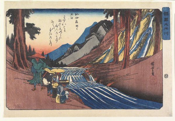 This woodblock print, crafted by Utagawa Hiroshige, presents us with the peak of Sakanoshita, a poignant name hinting at artistic abandonment. Dominating the composition is the mountain, its form echoed in the posture of the travelers below. Mountains, in Eastern art, are not merely geological features but powerful symbols of stability, endurance, and spiritual aspiration. In this print, the mountain's imposing presence contrasts with the transient figures, suggesting a tension between the eternal and the ephemeral, or the sublime and the everyday. Consider the recurrent motif of the traveler throughout art history. From the weary pilgrims in medieval manuscripts to the wandering figures in Romantic landscapes, this symbol embodies the human quest for meaning, knowledge, and self-discovery. Here, the travelers remind us of our own journeys. They traverse through life, much like how images traverse through time and space, carrying echoes of past experiences. This print evokes a deep psychological resonance. The act of "throwing away the brush" suggests a moment of creative crisis, a surrender to the overwhelming beauty of nature, an attempt to find stillness in a fast-moving world.