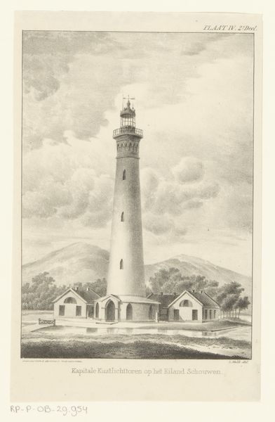 Curator: It's striking, isn't it? Something about that single tower in such stark surroundings creates a sort of forlorn beauty. Editor: Indeed. What we have here is a photogravure, dating from before 1883, titled 'Vuurtoren van Cordouan'. This artwork offers a captivating glimpse of a cityscape defined by the imposing lighthouse, meticulously rendered with incredible detail. Curator: I love the sense of isolation; it really emphasizes how precarious our existence can be and the importance of light as guidance. Also, just a few souls milling about… you wonder what it was like for them. Editor: Precisely, if we analyze the composition structurally, the tower acts as a vertical axis, which imposes its will onto the landscape—that’s further highlighted by the atmospheric perspective, subtly implying a vast expanse of space with its graduated tones. The structure dominates. Curator: It seems the print medium, with its monochrome, heightens the sense of distance, lending a melancholy air—almost like a faded memory. It makes you think, are memories merely images becoming fainter over time, as light gradually fades? Editor: Possibly, but this treatment could also underscore the technical prowess necessary for photogravure, which melds chemical process with an artistic intention to make such tonal control possible. Look at the texture, the gradients; the lighthouse stands monumental and solid because of these decisions. Curator: You know, in a way, its imposing stature makes me feel small yet comforted—strange paradox, no? A silent guardian promising safe return; quite a comforting notion, especially if you spend your nights alone at sea... Editor: Yes, certainly. The photograph captures not only architectural design but also cultural importance as a symbolic form—making evident our desire to control the chaos of the natural world through symbolic assertion. It’s impressive to examine its effect across time. Curator: True enough—each vantage gives way to fresh observation. I hadn't previously appreciated it in its fullness—the photograph does evoke powerful feelings when truly considered. Thanks to that photogravure the lighthouse keeps sending signals! Editor: My pleasure—we’ve extracted significance on both formal and emotional levels by the combination of analysis with subjective understanding, in turn leading back, recursively to the visual impression… and perhaps also, as you’ve implied to the emotional echo that a mere image can create across time.