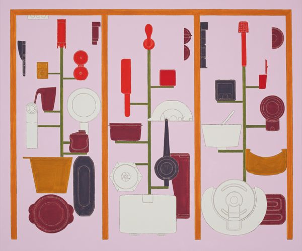 Alfio Giuffrida’s 'Spiegel' is like stumbling into a dream logic world made up of everyday objects. There is a real joy in the simple colour palette and the way Giuffrida approaches the surface of the canvas; it's all about the layering and building up of forms. You can see that Giuffrida is really thinking through the relationship between each of the objects he is portraying. The objects are rendered in flat colours, which creates a disorientating and slightly unreal feeling. Giuffrida isn't trying to trick us into thinking these are real objects, more that they are stand-ins for thoughts or memories. Take, for example, the way he renders the handles of each "mirror," these are so flat and solid, so certain of themselves! I am reminded a little bit of Giorgio Morandi, but if he'd had a much weirder junk drawer. Ultimately, it's this openness to playful interpretation that makes Giuffrida's work so rewarding.