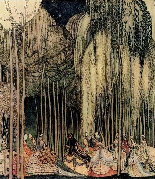 Curator: Here we have “Tomtar,” a gouache work tinged with the aesthetic of Romanticism and the ethos of fantasy-art. Although there isn’t a known creation date or specific location attached to this image, its creation is attributed to John Bauer. What springs to mind as you look upon this composition? Editor: Immediately, I am drawn to the ambiguous, dreamlike quality it evokes. It's draped in a palpable atmosphere, almost mournful, yet with a hint of delicate magic – is it the onset of dusk, a premonition, or simply a veil cast by secrets unknown? Curator: Bauer’s work often draws on folklore. Looking at it from this perspective, one might see it less as mournful and more as representative of liminal spaces. What clues in the visual narrative might support such a contextual reading? Editor: Certainly, the figures, positioned within a liminal forest clearing, hands uplifted as if beckoning or beseeching, suggest a symbolic threshold. They're framed by potent symbols – the flight of doves often associated with peace or transition, and an effusion of suspended shapes evocative of a mysterious rain of secrets, imbuing the work with profound depth. Curator: That's a keen observation! This artist engaged directly with early twentieth-century discussions surrounding gender, particularly around representations of femininity. Looking closer at the blond figure and the details of their garments, how do you believe we could interpret such an intersectional lens to analyze these narrative clues within the romantic landscape? Editor: Their clothes echo those of a period past, hinting at the layers of performance through history, perhaps gesturing to traditional portrayals that lock them within fairy-tales – perhaps even, subtly, evoking concerns of self-image during periods of increased anxiety surrounding women's freedom and shifting agency. Curator: Exactly! The layering and texture add dimension to this narrative—in effect, by intertwining conventional imagery with contemporary socio-political tension during the early twentieth century. Editor: Precisely—it unveils complex layers! It’s like peeling back the layers of time itself and exposes long histories – from intimate folklore all the way up through cultural assumptions – creating an intricate palimpsest that reflects broader currents and questions central to their moment. Curator: These potent cultural questions are what ultimately keep our interpretations fresh—continuously reshaping and breathing new context into our interpretation. Editor: Yes. The image becomes more than a snapshot of an individual aesthetic. It transforms into a poignant relic and an archive through which both ourselves and generations may view symbols, histories, and ever evolving socio-cultural memories through this artwork.