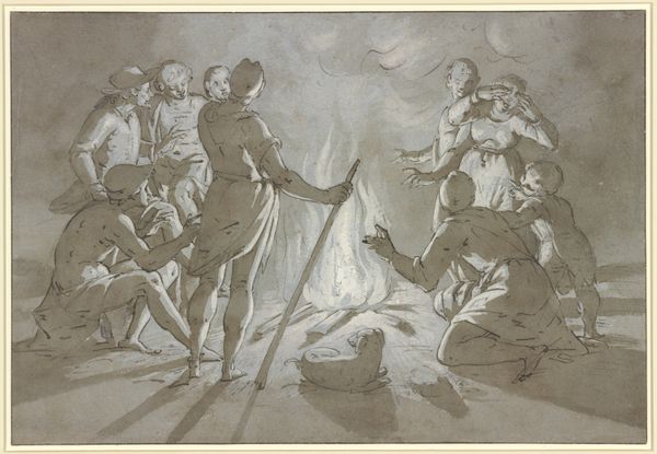 François Joseph (II) Pfeiffer made this watercolor of the Cossack camp outside the Muiderpoort in Amsterdam in 1813. The scene is enveloped in a nocturnal palette, dominated by the stark contrast between the campfire's glow and the surrounding darkness. The intricate network of bare tree branches against the moonlit sky creates a complex, almost chaotic composition. Consider how the artist uses light not merely to illuminate but to structure the scene. The fire acts as a focal point, its warmth drawing the eye, while the surrounding figures are cast in dramatic chiaroscuro, emphasizing their forms. Pfeiffer masterfully balances the detailed rendering of the foreground figures with the more impressionistic depiction of the background, creating a sense of depth and atmosphere. The scene is more than a historical depiction; it's a study in contrasts: light versus dark, warmth versus cold, order versus chaos. It embodies the Romantic era's fascination with the sublime, with the way art captures a sense of awe-inspiring ambivalence. It invites us to question the relationships between space and perception.