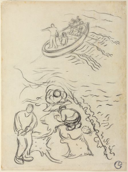 Editor: This is "A Man in a Boat Lifting a Fish on a Line. Beneath, a Sketch of a Fisherman, a Head and a Nude Man" by Nicolai Abildgaard, dating from 1743 to 1809. It's an ink drawing on paper. I’m struck by how the figures, particularly the fisherman in the boat, seem both classical and almost comical. How do you see this work, considering its historical context? Curator: The drawing exemplifies Abildgaard's engagement with classical ideals and, importantly, his critical lens towards the societal norms of his time. His work often functioned as a commentary on power, gender, and class. The "comical" aspect you noticed is likely a deliberate choice, a subversive element that prompts viewers to question established hierarchies. The nudity, the fishing— these are not merely aesthetic choices. How do these images resonate with contemporary debates about labor and representation? Editor: That's interesting. I hadn't considered the class implications of depicting a fisherman in this classical style. Does the juxtaposition create tension? Curator: Precisely. Abildgaard appropriates and subverts classical aesthetics, using them to elevate the everyday lives of ordinary people but simultaneously exposes the constructed nature of those ideals. Think about the art academies of that era: who was represented and whose stories were considered worthy? Do you think the presence of a preparatory sketch within the final drawing reinforces this idea? Editor: Yes, it's like he is peeling back layers of artifice. The inclusion of those figures and the fisherman’s caricature remind us that these images aren't neutral. It challenges viewers like me to question historical narratives and their influence. Curator: Absolutely, and Abildgaard’s art is a tool for prompting critical thinking. Hopefully it gives the opportunity to explore alternative voices and perspectives, past and present. Editor: I agree. I’m starting to see art's potential for questioning dominant narratives and sparking critical dialogues about society. Thanks!