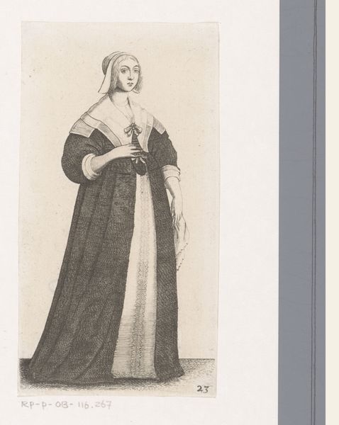 Jan van Troyen made this print, *Rouwende Maria*, in the Netherlands during the 17th century. The image is part of a larger bound collection of prints, making this Maria a mass-produced image rather than a unique painting. During this period, the Catholic Church commissioned and distributed devotional images like this one to reinforce religious doctrine and inspire piety among believers. These images often focused on the suffering of Mary, as a way to evoke empathy and encourage identification with the Church. The "Mater Dolorosa," or sorrowful mother, was a popular subject as the Catholic Church encouraged emotional displays of faith and mourning as a way to express their faith. Studying the original commission and distribution of prints like these gives us a fascinating insight into the culture of 17th century Netherlands, and the complex relationship between art, religion, and society. Resources like ecclesiastical records can shed light on the network of production and consumption that gave this image meaning.