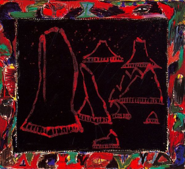 Curator: Ernst Ludwig Kirchner’s woodcut, “Mountains in Winter,” created in 1919, is a powerful image. The contrasts are startling. Editor: Yes, the first impression is intense. The stark reds and blues create a dramatic tension. The whole piece seems charged with an almost palpable energy. Curator: The composition employs dynamic diagonals. Note how the lines of the mountains guide the eye, and how the sharp angles evoke the harshness of the winter landscape. It’s exemplary of German Expressionism. Editor: Thinking about the production of this work, creating such strong contrasts through woodcut seems deliberate. The process of carving the block itself mirrors the harsh conditions he is depicting. It feels less like rendering than confronting. Curator: Kirchner’s simplification of form, especially in the mountain range, is striking. He’s reduced the landscape to its barest essence, expressing a subjective experience rather than objective reality. Editor: Exactly. And considering that this piece was made shortly after his service in World War One, one must ask, how did the labour, its making, assist in articulating the psychological landscape, that very particular disquiet felt in postwar Europe. The material means became a release. Curator: I’m inclined to agree. The limited colour palette—that stark juxtaposition of red and blue, against the pale yellow—creates a sense of unease and isolation, furthering that exploration of mental state. Editor: So what’s left is, beyond form and intention, the pure feeling, or rather the making of feeling: the labour, the craft and that post-war ache given form. The physical demands of the printmaking became cathartic. Curator: That’s an interesting reading, thinking of catharsis in the printmaking itself. The graphic impact, its pure bold emotionality… that persists to this day. Editor: Indeed, a potent confluence of artistic skill, personal turmoil, and material process has converged to create something quite lasting.