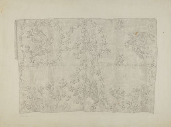 Editor: So, here we have Irene Schaefer's "Stuffed Bureau Cover," a drawing from around 1936. It's primarily pencil on paper, though it feels lighter, airier, almost like lace. It reminds me of a forgotten craft pattern. What strikes you when you look at it? Curator: Ah, a ghost of domesticity, wouldn’t you say? I find myself drawn into this quiet rebellion against utility. A bureau cover… meant to protect, but here, just a suggestion, an ephemeral drawing of what *could* be. It’s like dreaming of housework, rather than doing it! And those floral arrangements – almost bursting forth, aren't they? Perhaps Schaefer is playing with the idea of nature trying to reclaim the stiff formality of domestic spaces. Or am I projecting again? What do *you* make of these contained explosions? Editor: I hadn't thought about it as a rebellion, more like…a gentle suggestion. But "dreaming of housework" is spot on! It *is* odd to memorialize something so…ordinary. Curator: Ordinary made extraordinary! Isn’t that the heart of it all? Turning the mundane into something worthy of contemplation. The very act of rendering this, of choosing these particular forms, it's an act of defiance against the relentless march of daily life. Do you think she saw beauty in this intended cover or something else? Editor: Perhaps it's a testament to finding beauty in the everyday, even in something as simple as a bureau cover. Like pressing flowers. Curator: A lovely thought; it's really got me pondering her interior landscape. Something to chew on, isn’t it? Editor: Definitely! It's made me look at domestic objects with new eyes, that's for sure.