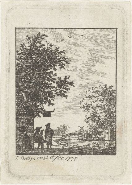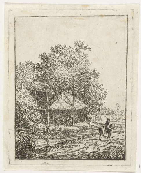 Curator: This unassuming little etching immediately gives me a feeling of peace. I can almost smell the damp earth and hear the leaves rustling. Editor: And indeed, we are presented with David van der Kellen’s "Hunter in a Landscape," crafted somewhere between 1814 and 1879. What strikes me foremost is the work’s composition. The scene feels delicately balanced. Curator: Balance, yes! I sense that too, the thatched cottage grounded firmly on the left is somehow perfectly balanced by the open space, trees, and promise of the landscape on the right. What seems simple reveals itself to be incredibly deep. Editor: It’s the semiotic layering, isn't it? The house represents domesticity and shelter while the figure of the hunter suggests exploration, movement, a subtle nod to our engagement with the natural world and genre. It’s a juxtaposition! Curator: I see what you mean; that duality, this dialogue between home and journey. Maybe that is why it feels so… well, so complete. I could get wonderfully lost right here in this etching. What did capturing light and shade like this represent to someone living back then? Editor: Precisely, the way Van der Kellen renders light and shadow is masterful, directing the viewer's eye across the landscape and hinting at what remains beyond our sight. The linear work of etching provides an incredible opportunity to model texture this way. Curator: He captures it with such gentleness that it feels so true! It reminds me of evening walks in the country with my own dog, actually. There is something really charming about his companion, too, such simple details bring everything alive, it shows such craftmanship in rendering those shapes with what might be perceived at first glance as little work. Editor: Craft, yes, this is indeed something you note straightaway as the formal qualities indicate. "Hunter in a Landscape" then, is more than just a representation; it’s an invitation to wander. Curator: A reminder to seek balance, even when the path forward isn’t clearly drawn!