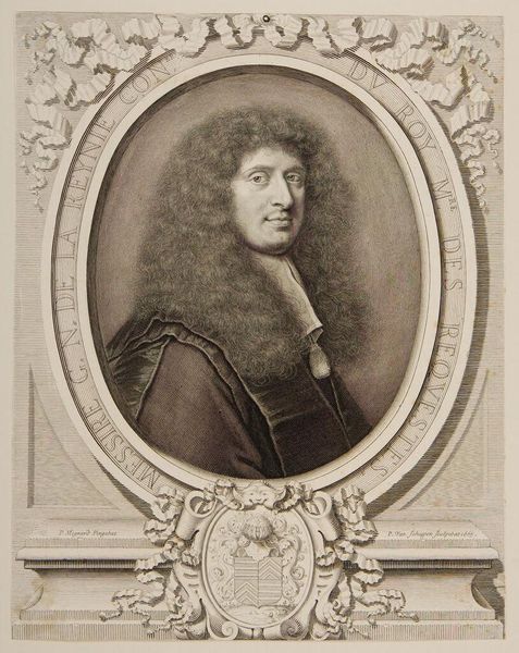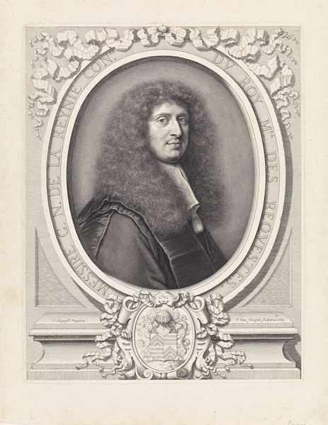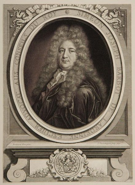 Curator: The formidable hair is my immediate impression; it's so voluminous, it almost overwhelms the figure. Editor: This is Pieter van Schuppen's engraving of Nicolas Gabriel de la Reynie, a King's Councillor. Look closely at the details achieved through the printmaking process. Curator: Absolutely. The contrast between the textures—the dense, swirling hair, the smoother skin, and the crisp lines of the lettering—is remarkable. I am curious about the social conditions enabling such craftsmanship. Editor: Consider, too, the institutional power at play. De la Reynie held a significant public role; images such as these were tools for projecting authority. Curator: And also for consumption. Who could afford such an item? Editor: Indeed, it serves as a potent artifact reflecting its historical moment, while also reflecting power. Curator: Precisely, it speaks volumes about the labor and systems of production of the day.