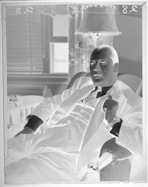 Editor: This photograph, "Untitled (man sitting behind desk in office)" by Peter James Studio, captures an office scene. The inverted tones create a stark, almost dreamlike quality. What visual elements stand out to you? Curator: The composition immediately strikes me. The severe horizontals of the blinds and desk contrast with the man's rounded form. Note how the light, though inverted, emphasizes the geometry, dissecting the space into distinct planes. Editor: It's like a study in contrasts, isn't it? Curator: Precisely. The negative space around the figure is as crucial as the figure itself, framing him within this constructed environment. Consider how the formal elements of line and shape create a visual tension. The rigid office against the softness of the man. Editor: I didn't notice that tension at first, but seeing how the shapes interact really changes how I view it. Curator: Indeed, it's through careful consideration of form that we may interpret the image beyond its surface representation.