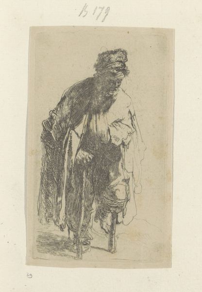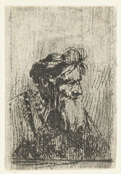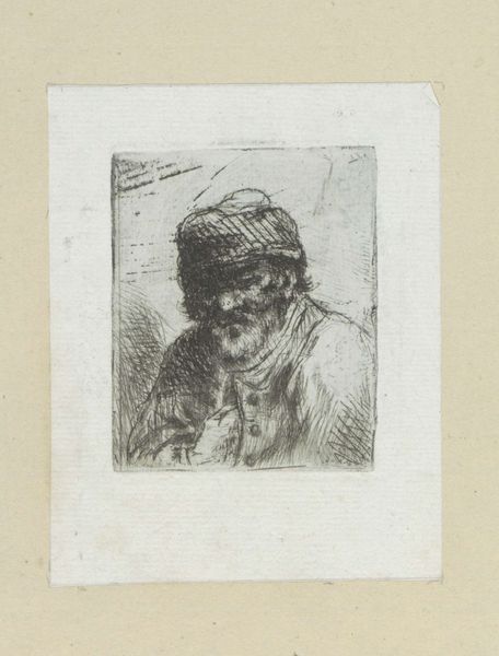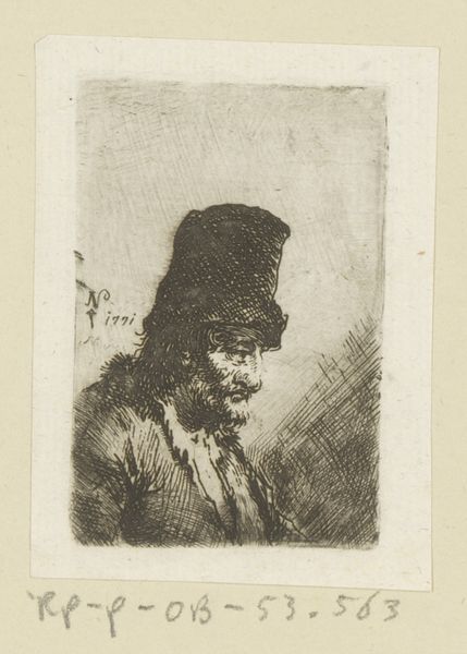 This is "Man met hoge muts," etched by Johann Andreas Benjamin Nothnagel in 1771. Immediately, the density of the hatched lines pulls you in. Look at how these lines define the form of the man's distinctive, towering hat, and the softer, almost scribbled marks that suggest his beard and fur-lined coat. The artist plays with light and shadow through the etching technique, building depth with a network of fine lines. See how the hatching varies in direction and intensity, creating a sense of volume and texture, particularly around the face and hat. The way Nothnagel uses line becomes a kind of code to understand not just the visual appearance of the man, but also a suggestion of his character or social standing. The print's power lies in its ability to capture a sense of character through purely formal means. It encourages us to consider how such visual elements might challenge or reinforce social constructs and individual identities. The meaning of this work remains open, evolving as we bring our own perspectives to bear on its intricate design.