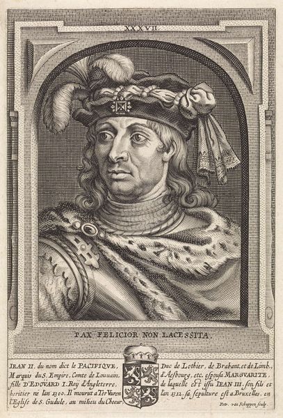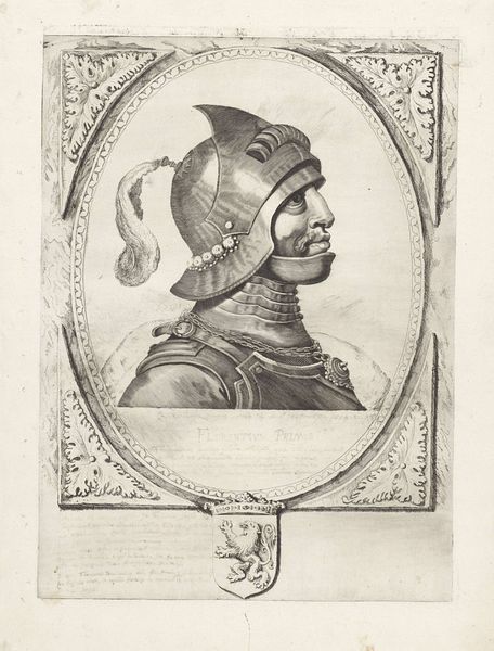 Editor: So, here we have "Portret van Karel Martel," a portrait of Charles Martel, from the 1660s by Pieter van Schuppen. It's an engraving, which is fascinating. He looks... well, stoic. Imposing, even in this small, detailed print. What strikes you when you look at this piece? Curator: Oh, there's a world to unpack here, isn't there? My initial impulse? To tell you that sometimes historical accuracy takes a backseat to artistic... flourish! That helmet, for instance, speaks volumes – or perhaps whispers loudly! It’s more theatrical than practical. Look closely, and it seems almost whimsical with that crest of feathers. Pieter is not only portraying Charles Martel; he is curating a legend around him. Does this align to what extent the so called Hammer truly acted for those values inscribed here? Editor: I see what you mean. It’s definitely more showy than what you'd expect for functional armour. Do you think that was common in portraiture back then – idealizing the subject? Curator: Absolutely! Think of Baroque portraiture as the Instagram filter of the 17th century. Van Schuppen is subtly amplifying Charles Martel's heroic image. This wasn’t simply about capturing a likeness. It was about projecting power and legitimacy. The flowing lines, the ornate frame... everything contributes to that effect. Tell me, how does the inclusion of the text affect your impression? Editor: Hmm... I hadn't thought much about the text... mostly because it's hard for me to read. Curator: Indeed. However, placing it alongside Charles' portrait invites one to not simply *see* him, but *read* him, and invites another angle on Martel's self-fashioned identity. But one could also ask what all this detail obscures from the picture as a whole. Editor: That’s a really interesting point – the reading versus seeing aspect. So much of how we understand figures from history comes from curated portrayals like this. Curator: Exactly! It is exciting how so many tiny lines become these portraits. Editor: Yeah! Well, I have to say, I hadn't considered the sort of… promotional aspect of it, or the way text frames visual information. This print tells so many stories.