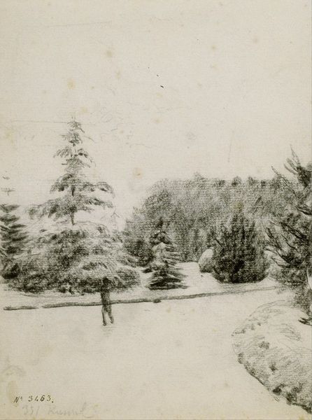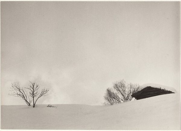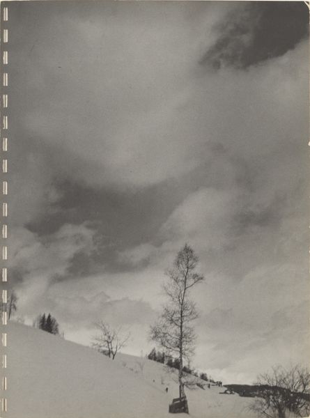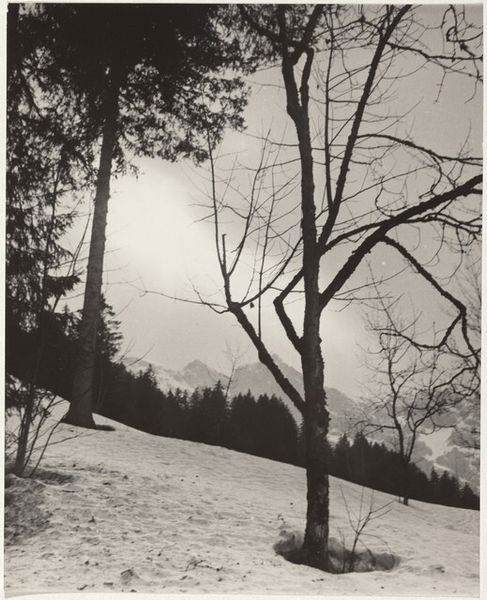 Editor: So, this is Robert Frank’s “Trees in Snow—Landscape,” a gelatin-silver print from between 1941 and 1945. I’m immediately struck by how the stark monochrome emphasizes the texture of the snow and the bare trees. It almost feels like a study in contrasts. What compositional elements stand out to you? Curator: Note the composition; it relies heavily on a diagonal line formed by the snow-covered slope. The bare trees, silhouetted against the pale sky, function as vertical counterpoints to this dominant angle. How does this stark, almost brutal simplicity inform the overall effect? Editor: It's interesting you call it brutal. I see simplicity, definitely, but more peaceful than brutal. I'm wondering about the lack of a clear focal point, it seems to keep the eye moving? Curator: Precisely. The absence of a central subject encourages a more distributed reading of the picture plane. Your eye moves across the surface, attending to the varying tones and textures. The composition subverts the traditional landscape photograph’s desire for a strong, hierarchical arrangement. Observe how the gradation of tones creates depth despite the monochrome palette. What does that tell you about Frank’s skill? Editor: It’s a testament to his masterful control of light and shadow, even without color. He's using a limited palette to convey a complex sense of space and atmosphere. This almost feels more abstract than representational. Curator: The reduction of the scene to its essential formal components — line, tone, texture — approaches abstraction, doesn't it? Consider how this strategy prompts us to engage with the photograph not merely as a depiction of a landscape, but as a carefully constructed arrangement of visual elements. Editor: I see it now. By removing distractions and focusing on form, Frank invites us to appreciate the inherent beauty and tension in the bare landscape. I initially saw it as peaceful but understand now that it's more complicated and has to do with the stark arrangement. Thank you! Curator: My pleasure. It is these elements of compositional structure that allow us further clarity when experiencing the artwork.