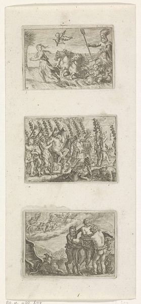 Curator: This etching, "The Multiplication of the Loaves" by A. Claude Philippe de Thubières de Caylus, presents the biblical miracle across three registers. It's fascinating how it visualizes power dynamics and resource distribution. Editor: It's interesting to see the story told in these three different ways on one page. What do you see in this piece beyond the religious narrative? Curator: Consider the context. Caylus was an antiquarian deeply invested in classical forms. How does this etching engage with or subvert those classical ideals in service of representing a moment of shared sustenance? What statement is he making about collective well-being? Editor: So it's not just about the miracle, but about the idea of shared resources and community? I hadn't thought of it that way! Curator: Precisely. Art always operates within a web of social and political meanings. Editor: Thank you! Looking at it that way, I’ve learned so much more.