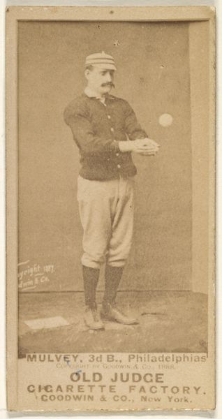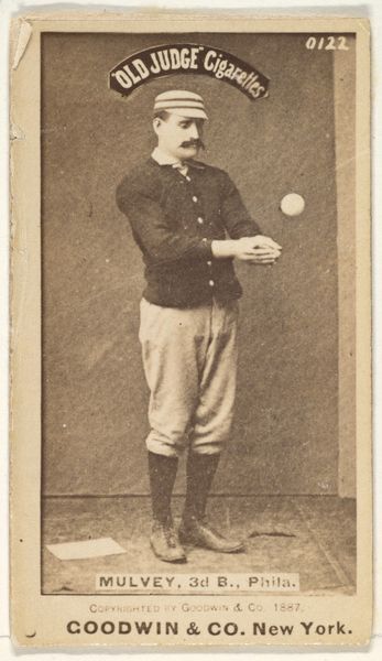Editor: So, this is "John J. 'Jack' Clements, Catcher, Philadelphia," from 1887, made by Goodwin & Company for Old Judge Cigarettes. It seems to be a print based on a drawing or photograph. The image has an aged, almost sepia-toned quality. What strikes me is how this small card highlights both the athleticism and the commercialism of the time. What stands out to you? Curator: The card is more than just an image of an athlete. Consider the materiality – a mass-produced print included with cigarettes. This immediately dissolves the boundary between high art and everyday commodity. Think about the production process: a photo or drawing, then reproduced en masse for a decidedly working-class product – cigarettes. Editor: That's fascinating! I hadn't considered the cigarette connection so deeply. How does that change how we see the image? Curator: It invites us to question what is being sold. Is it just cigarettes, or is it also aspiration, fame, even a vision of American masculinity connected to athleticism and success? How are these values shaped through the labor of producing both the image and the cigarette? Consider the target audience. Working-class men buying these cigarettes, seeing Clements – what kind of desires or identifications are being manufactured? Editor: So, the value isn't just in the baseball player, but in the whole system of production and consumption... and how that reflects social values? Curator: Exactly. It's about unpacking the social relations embedded within this seemingly simple piece of commercial ephemera. Who benefits, what’s the cost, and what ideologies are reinforced? Editor: This card reveals a complex web of production, consumption, and social meaning, far beyond a simple baseball portrait. Thanks! Curator: Indeed. Examining the material conditions and context shifts our understanding of value entirely.