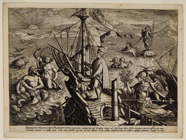 Curator: Ah, this print captures a rather dramatic moment. Titled "Storm on the Sea of Galilee," and dating from 1598-1618, it comes to us via Cornelis Galle I, currently residing in the Rijksmuseum's collection. The scene is rendered as a black and white engraving. Editor: My first thought? Pure terror! The diagonal lines of the rain and waves create this dizzying sense of imbalance, and the small boat looks like it’s about to be swallowed whole. The emotional resonance is powerful, it makes the holy book stories seem vivid! Curator: Precisely. Galle's technique here, working in engraving, yields sharp contrast that further intensifies that feeling of tumultuous chaos. The very texture, the meticulously etched lines, build a world ready to burst at the seams. Note the precise interplay between darkness and light; a visual argument almost. Editor: I'm immediately drawn to the figure clinging precariously to the mast – he represents, visually, faith holding on in the face of overwhelming adversity, don’t you think? This tempest acts as a profound symbol of the trials and tribulations that believers may face in the world. The upturned boat itself a metaphor of life’s hardships! Curator: Symbolism aside, consider the structured organization. We see a powerful visual hierarchy, light defining form amid surrounding shadow, as perspective and vanishing points amplify depth—effectively creating pictorial drama from otherwise limited tonal variations. Editor: Right, but there's a deeper reading there! In a time of religious conflict, the turbulent sea might also reflect broader anxieties about societal stability. Remember, water has forever been a powerful symbolic component; often embodying concepts of chaos, rebirth, purification...or fear! Curator: Yes, that is undeniable, although the formalism makes the point more succinctly. In essence, this image functions not simply as historical document or artwork, but as the nexus of visual and philosophical enquiry! Editor: And an iconic depiction of humanity grappling with elemental power, echoing deep-seated fears and the enduring search for solace amid life’s storms. A message, conveyed through symbolic weight as much as skillful line. Curator: A synthesis we must continually pursue, indeed! Editor: Well said.