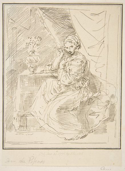 Curator: Immediately, the looseness of the line work strikes me; there's almost a frenetic energy in what appears to be a religious scene. Editor: Let’s delve into this drawing. It's titled "The Holy Family with the infant Saint John the Baptist, and other saints and angels" by Giuseppe Canale, created around 1775. Currently, it resides here at The Met. It's crafted with pen and brown ink, creating a compelling figuration. Curator: It is quite baroque with that emphasis on light and shadow through hatching and cross-hatching... it also seems hastily rendered and even unfinished to my eyes. What can you tell me about the print making practice? Editor: In terms of context, this type of print served multiple purposes. Consider how the means of reproduction—the pen and ink translated into a print—enabled wider dissemination of religious imagery, potentially impacting the faithful’s understanding of devotion, salvation and religious instruction beyond traditional avenues controlled by the Church. This democratization, however, came with its own set of social power dynamics at play depending on consumption habits and income brackets within period society! Curator: That connection between production, access and the church is exactly why Canale chose ink, and then print making to distribute. But to me it doesn’t fully express emotion of the family; even though baroque, there is lack of texture. Perhaps, a trade of access over expressiveness. Editor: Well, I find its linear style contributes a raw, emotional honesty. You sense their struggle and faith because of, not despite, the line work! I see figures bound by their circumstances as well their devoutness... Curator: In my experience, there needs to be an even exchange in materiality versus conceptual accessibility in baroque prints…Here though it teeters… Editor: Perhaps we disagree, but it does reveal layers of historical context and meaning. The conversation alone is compelling. Curator: Absolutely—I now can sense a certain social narrative that I did not realize initially.