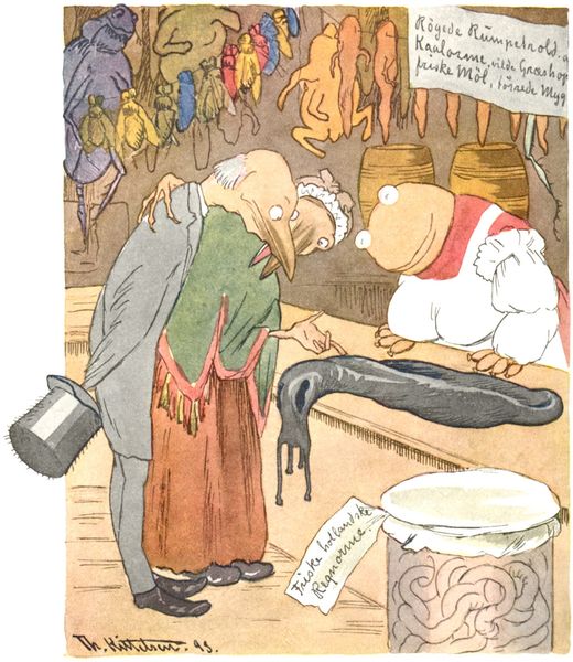 Editor: Here we have "Premature Births," a watercolour illustration from 1894 by Theodor Severin Kittelsen. There's such a whimsical yet unsettling mood, especially with those characters looming over the newly hatched bird. How do you interpret this work? Curator: It's tempting to see this as simply a charming children’s illustration. However, Kittelsen was deeply engaged with Norwegian folklore and social commentary. Consider the late 19th-century context: burgeoning industrialization, anxieties about societal shifts, and a romantic longing for an idealized rural past. Editor: That makes sense. The juxtaposition is pretty strong. Curator: Precisely. We have these almost grotesque bourgeois figures, presented as frog-like creatures in formal attire. What might they represent in contrast to the vulnerable, 'premature' bird and the traditional symbol of the nest? Is Kittelsen perhaps critiquing the perceived disconnect between the human world and nature? Editor: I hadn't thought about them representing the bourgeoisie, but with the top hat and umbrella, it fits. So it's not just a cute picture. Curator: The power dynamic is key here. The creatures appear to ‘help’ the bird but perhaps with an ulterior motive, or simply without understanding the true needs. Consider how institutional powers often dictate the terms of care and development, overlooking the natural course. Who benefits from this ‘premature’ intervention? Editor: So, by viewing it through that lens, the painting seems to be suggesting something more subversive about societal structures. It challenges our own assumptions about helping those deemed 'less fortunate'? Curator: Exactly! By utilizing folklore and anthropomorphic figures, Kittelsen cleverly uses art as a medium for cultural critique. The seemingly innocent scene holds a mirror up to society and its treatment of the natural world. Editor: This was so insightful; I wouldn't have picked up on those nuances without that background information! Thanks! Curator: My pleasure. It’s important to remember art exists within a social context, and unraveling those threads often makes the viewing experience much richer.
