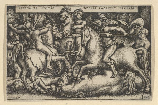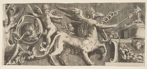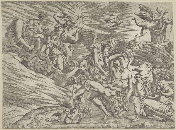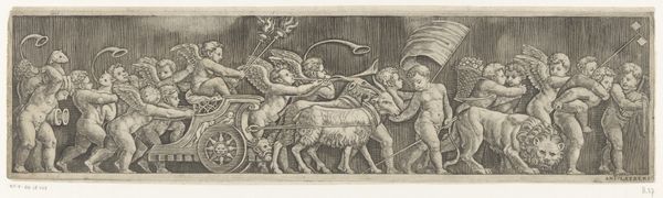 Editor: This is *The Triumph of Neptune* by Peregrino da Cesena, made sometime between 1490 and 1510. It’s an engraving, and what immediately strikes me is how dynamic it is! The horses pulling Neptune's chariot are so energetic. How do you interpret this piece in its historical context? Curator: Considering the Renaissance fascination with classical antiquity, this engraving showcases a clear interest in reviving and reinterpreting Greco-Roman mythology. Think about the socio-political implications of visually embracing narratives where a god triumphs: How might this piece, and others like it, function as a statement about power? Editor: It's interesting that you frame it as a potential statement of power. I hadn't considered that directly. Curator: Well, who commissioned it? Who was the intended audience? Remember, during the Renaissance, art wasn't merely decorative; it served specific purposes, reinforcing societal structures, ideals, and sometimes, even propagandistic messages. Also, how does the act of engraving, itself—its reproducibility— affect the reception and circulation of such a potentially politically-charged image? Editor: That’s a great point. Because it's a print, it could be distributed more widely and have a larger impact on shaping public perception. Curator: Exactly! And beyond its socio-political function, consider how the portrayal of Neptune, with his trident and powerful steeds, reinforces established narratives of male dominance. Who is allowed power, according to the piece, and on what grounds is this power granted? Editor: So, seeing it as more than just a classical scene helps unpack potential power dynamics and the impact on a wider audience through printmaking. Thank you. Curator: Indeed. Looking at art as a product and a producer of history helps us see its multifaceted roles within society.