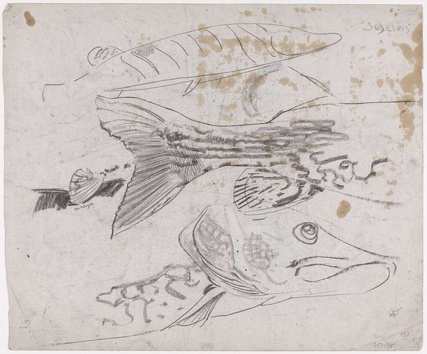 Gerrit Willem Dijsselhof captured a 'Sketch Sheet with Studies of a Haddock' with ink, around the turn of the 20th century. The haddock, rendered with a delicate yet precise hand, becomes more than just a fish; it becomes a symbol, a signifier laden with historical and cultural weight. Consider how the image of the fish appears in early Christian art, a coded symbol representing Christ himself. Now, here, the fish isn’t overtly religious, but the echo of that ancient symbolism lingers, transformed yet present. Dijsselhof’s fish, caught between the realms of art and nature, reminds us of how motifs migrate across time, shape-shifting as they traverse different cultural landscapes. The act of sketching itself—capturing fleeting moments of existence—reveals a deeper, perhaps subconscious, desire to preserve and understand the natural world and its profound symbolism. This drawing evokes a sense of both scientific curiosity and primal recognition of the cyclical nature of life and death, creation and decay.
