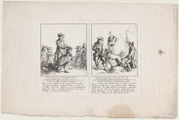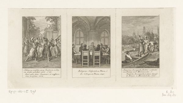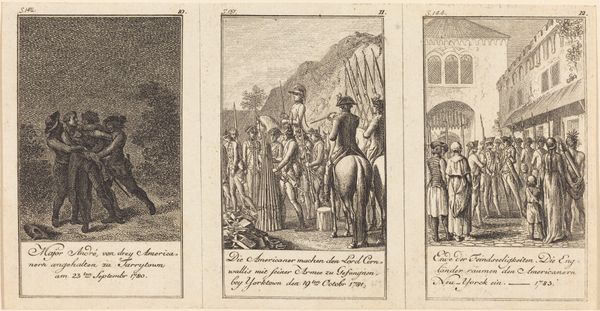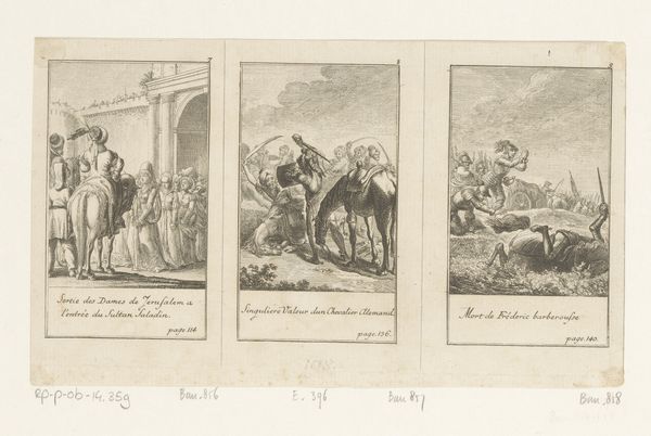 Editor: This is "Anecdotes of King Frederik II", an engraving made in 1793 by Daniel Nikolaus Chodowiecki. It reminds me of a comic strip, with these three scenes side-by-side. How would you interpret it? Curator: I see a powerful commentary on leadership and its connection to the social fabric. The work presents Frederik not just as a ruler, but as a figure interacting within the broader social sphere. What strikes you about the scenes represented? Editor: Well, the first one seems about love, the second a battle scene, and the third a reward. They feel like simple morality tales. Curator: Exactly. They operate on the surface as simplistic historical vignettes, but can you consider how they reflect or challenge notions of power? Are these genuinely complimentary, or might Chodowiecki be subtly critiquing Frederik’s image? The "anecdotes" aren't just neutral recountings, they're curated narratives meant to project certain ideals. How do these ideals then serve specific power dynamics? Editor: I hadn't considered that... So, the selection of these specific moments isn't accidental. Curator: Precisely. By emphasizing Frederik's interactions with commoners, soldiers, even, perhaps, a lover, Chodowiecki touches on issues of class, gender, and the very nature of heroism. How do you see this piece fitting within the broader context of late 18th-century political thought? Editor: That's given me a lot to think about. I appreciate understanding the stories as constructions of power rather than straightforward accounts. Curator: Indeed, and seeing art as embedded in these systems can lead to richer and more nuanced understandings.