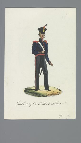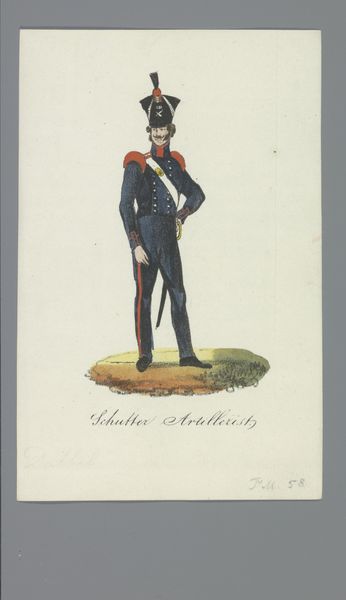 Albertus Verhoesen created this print of a soldier using etching and hand-coloring. It depicts a soldier in uniform, likely made in the Netherlands during the first half of the 19th century. This image, on the one hand, presents a straightforward depiction of military attire. On the other hand, it raises questions about the role of the military within Dutch society at the time. Consider how the soldier's uniform and posture reflect specific military standards and cultural values of the time. Aspects of Dutch society, like class structure, political movements, and economic systems might have influenced the image. To grasp the artwork's meanings, we need to investigate military history, costume design, and the politics of representation. Studying historical sources helps us understand the role of art in shaping social identity. We can explore art's meanings as reflections of specific cultural moments.