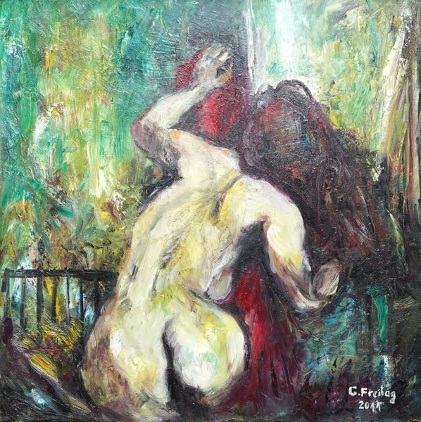 Editor: Here we have Gazmend Freitag's "Sonjuschka's Dance," an oil painting from 2015. The bold, almost Fauvist colors give it such a vibrant energy, but the brushstrokes seem almost rushed, raw. What do you make of it? Curator: I see a fascinating interplay of material and meaning here. The artist’s choice of oil paint – its inherent viscosity and drying time – directly influences the gestural quality of the work. How does the seeming urgency in application speak to a broader engagement with labor? The artist could be making a point by embracing what might otherwise seem as flaws in technique. Editor: I hadn't thought about the 'rushed' feel as a choice, more as… maybe a lack of refinement? So you're suggesting it could be commenting on the act of painting itself, as work? Curator: Precisely. Consider, too, the subject – a dancer. What is her social context? The materiality of her adornments - the implied value, but clear simplicity. It pushes us to question conventional art boundaries, demanding attention be paid to the materiality and consumption involved in depicting Sonjuschka and her dance, her red garment serving as an almost violent flash. Editor: That's so interesting. So, by drawing attention to the actual materials and process, the artist shifts the focus away from just the image of the dancer… Curator: …And towards the socio-economic and cultural factors underpinning both its creation and our perception of it, asking the viewer to reconsider the high art, low art dialectic when assessing what can be seen to be Expressionist in its execution. What we may term amateur we might also, upon further examination, decide has its own distinct sophistication and meaning. Editor: I definitely have a new appreciation for this piece. It's not just a pretty picture; it's a conversation about art-making itself. Curator: Indeed, and that awareness, itself, is part of the artist's material engagement and social challenge.