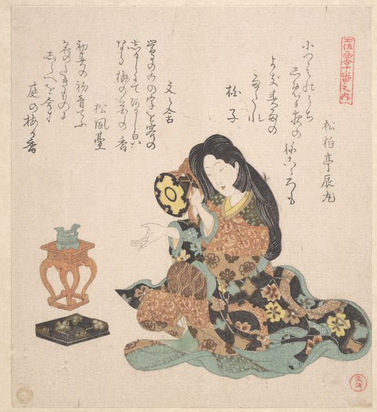 Curator: Here we have Kubo Shunman's "Woman Playing on the Shamisen," created around 1815. It's a woodblock print, a beautiful example of Ukiyo-e, housed here at the Met. Editor: It strikes me immediately with its gentle grace. The woman's posture, the soft colors, the overall composition evokes a sense of calm intimacy. Curator: Ukiyo-e prints like these weren't just art objects; they were vital cultural documents. This one presents an intimate snapshot of leisure in the Edo period. Images like these played a role in shaping ideas about entertainment and female accomplishment within Japanese society. Editor: Absolutely, and the shamisen itself is laden with symbolism. It's not merely a musical instrument; it represents the arts, cultural refinement, perhaps even subtle allusions to geisha culture. The seated pose itself is so common. The shape and placement of that dark curved hair is a perfect response and frame of the upper instrument’s curved features. Curator: Exactly! The details in her kimono and the delicate lines of the shamisen, were intentionally and precisely printed and signal this image's position within the broader context of print production. Were it made for mass appeal or a specific niche of interested buyers? The image of an elegant woman engaged in a cultivated pastime appealed to the tastes of the upwardly mobile merchant class. Editor: You can almost hear the music, you know? Though silent, this piece resonates. The presence of musical notes written here adds another layer of this. What sort of meanings do you see at work there? What type of experience are we intended to witness through its lens? Curator: It reinforces this moment's placement in artistic culture, it presents context on how artistic practices and social customs intersected and reinforced each other in early 19th-century Japan. In art of this kind, we glimpse the interconnectedness of representation and reality. Editor: The quietude, however, remains dominant for me. It suggests personal reflection even amidst its cultural encoding, so I really connect with the woman as subject despite our historical distance. It's amazing. Curator: And hopefully gives you a wider scope of understanding its time.
