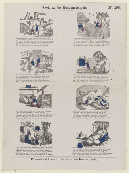 This print, made by M. Hemeleers-van Houter, uses lithography, a process that democratized image-making in the 19th century. Instead of laboriously engraving each image, the artist draws on a stone with a greasy crayon, then treats it chemically so that ink only adheres to the drawn areas. Look closely and you'll see that the black lines are quite soft. This is a direct result of the lithographic process, which allows for a more painterly effect than traditional engraving. The red and yellow were likely added through stencils, in separate passes of the press. The resulting image shows a page of moralizing verse accompanied by depictions of animals. Its very existence is a testament to the power of industrial production, which allowed for mass dissemination of images and ideas. The content is intended for children, which speaks volumes about the hopes and anxieties of the emerging middle class. Ultimately, this modest print reveals the complex interplay between art, industry, and social values, a reminder that even the simplest images can be powerful cultural artifacts.
