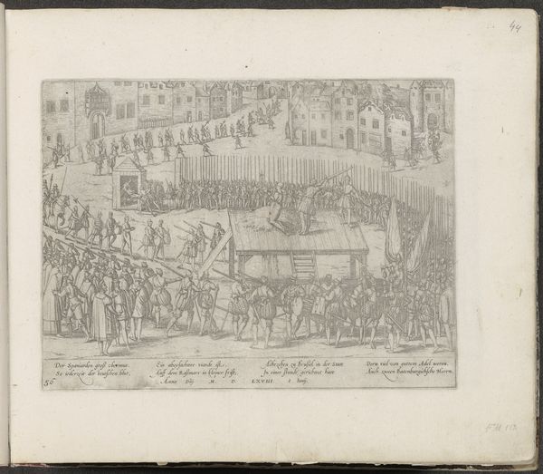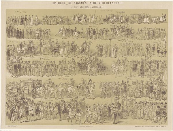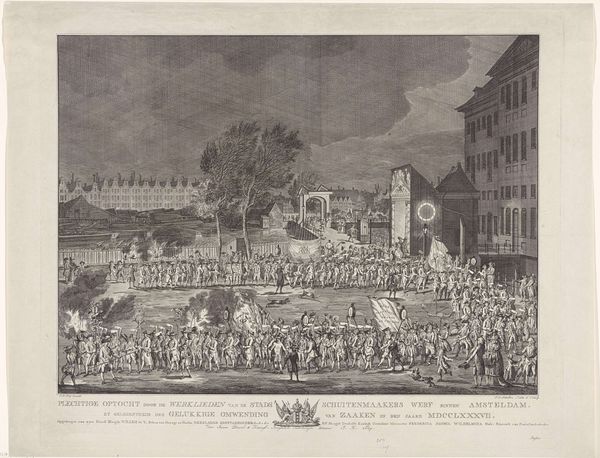 Editor: This is a print from 1863 titled "De plegtigheid der eerste steenlegging door Z.M. den Koning, voor het nationaal-monument in het Willemspark te 's Gravenhage, 17 November 1863" by an anonymous artist, an engraving showing a dense crowd and a formal ceremony. It seems like a record of a historical event. What significance might this event and its depiction hold? Curator: This engraving captures the laying of the foundation stone for a national monument, and to truly understand it, we need to situate it within the political and social currents of 19th-century Netherlands. This wasn't just about commemorating something; it was about forging a national identity. Look at the figures – who do you think is represented, and whose stories are left out of the frame? Editor: I notice the presence of what appear to be dignitaries but I don't really recognize anyone other than through titles that might identify their positions in government and military roles... Everyone depicted appears to be a man from what I can tell. Curator: Precisely. Who held power in that society, and whose perspectives were valued and memorialized? Understanding the context--such as the colonial past of the Netherlands--and how national identity was being constructed at that time, allows us to critically examine whose narratives were privileged, and which voices were systematically silenced in the construction of this ‘national’ memory. What does that tell us about whose stories are considered worthy of commemoration? Editor: It makes me think about the narratives that were pushed to the margins during that time, particularly considering the historical context of colonialism. This piece almost serves as a stark reminder of who held the power to shape national identity, erasing other experiences. Curator: Exactly. By questioning whose perspectives are missing, we can use this artwork to open up conversations about representation, power, and the complexities of history, moving towards a more inclusive and equitable understanding of the past. It becomes more than just a historical record, it's a site for critical engagement. Editor: I see it so differently now. It's more about uncovering hidden narratives and reflecting on how historical narratives continue to shape the present. Curator: Yes, questioning those narratives gives agency and restores missing perspectives to collective memory, enriching and expanding history, opening the way for truth and reconciliation in the present and the future.