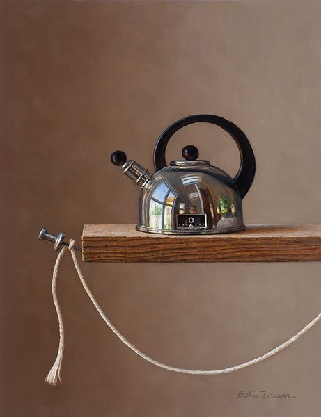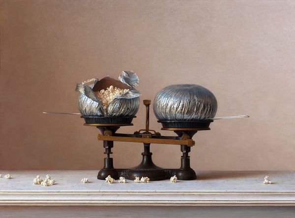 Curator: "Shiny Things," as this artwork by Scott Fraser is called, strikes me first with its sense of odd balance, a visual paradox really. Editor: Absolutely. The muted tones against those reflective surfaces create such a striking juxtaposition. There's an immediate tension, perhaps even an absurdity, presented by that antique scale being used in this way. It suggests we're meant to question not only the weight of objects, but the weight we assign them. Curator: Precisely! Think about scales as ancient symbols of judgment and justice. Then, Scott Fraser introduces the idea of culinary potential – a single frying pan, counter-balanced by these meticulously arranged silver candies, each glinting like offerings on an altar. I can’t help thinking about ideas of measurement, value, desire, and our almost primal need to classify things in the world. Editor: And the form itself, with its metallic finishes, evokes themes of artificiality versus nature. The balance feels so precarious – like a socio-political structure on the brink, where consumerist culture threatens genuine connection. I also can't overlook the fetishistic element. Shiny, tempting... are these merely aesthetic arrangements, or does it speak to deeper inequalities and societal imbalances? Curator: Yes! By placing these disparate objects – a mass-produced pan versus miniature handmade objects – in equilibrium, it questions if value can ever be truly balanced when the symbolism itself is deeply entrenched within societal hierarchies. It resonates with collective, cross-generational yearning. Editor: It makes you think, what are we actually weighing here? Fraser brilliantly makes us consider material culture. The quiet subversiveness hints at bigger structural critiques about value systems… very clever, really. I'll definitely be sitting with this piece a while longer. Curator: Absolutely. An artwork where meaning unveils slowly, revealing itself only when viewed from multiple perspectives. And to realize it's only through multiple interpretations that it shows its ultimate value.