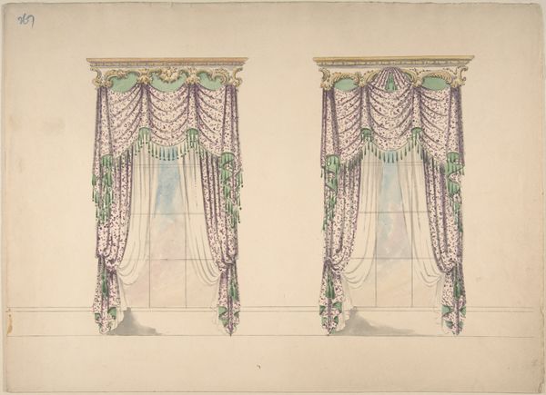 Editor: Here we have "Design for Pink, Mauve and White Floral Curtains with a Gold and White Pediment," made sometime between 1815 and 1840 by an anonymous artist. It’s a watercolor drawing that seems to represent, well, a curtain design! The detailed floral pattern and elaborate pediment give it a very opulent feel. What do you see in this piece that tells us about its time? Curator: These curtains offer a glimpse into the aspirations of the rising middle class during the Romantic era. The use of watercolor allowed for wider circulation of design ideas through prints. Note how the detailed floral pattern, reminiscent of garden imagery, brings the Romantic ideal of nature indoors, reflecting a desire to emulate aristocratic aesthetics and values. Do you see any indications about who might have owned such curtains? Editor: Hmm, the gold and white pediment seems rather extravagant. It suggests that they would have been expensive to produce, so maybe someone fairly wealthy? Curator: Exactly. Such elaborate window treatments served not only a practical function, controlling light and privacy, but also as a public declaration of wealth and taste. The choice of colours is interesting; pink and mauve, while delicate, would have required specific dyes, adding to the overall expense and highlighting the owner's access to luxury goods. And this all reinforces social hierarchies. These curtains weren't just for keeping the sun out! Editor: That makes so much sense. It’s fascinating to consider how something as everyday as curtains can be a marker of social status. I’ll never look at window dressings the same way again! Curator: Indeed. By examining the material culture, such as this curtain design, we gain insight into the social and political landscape of the time.