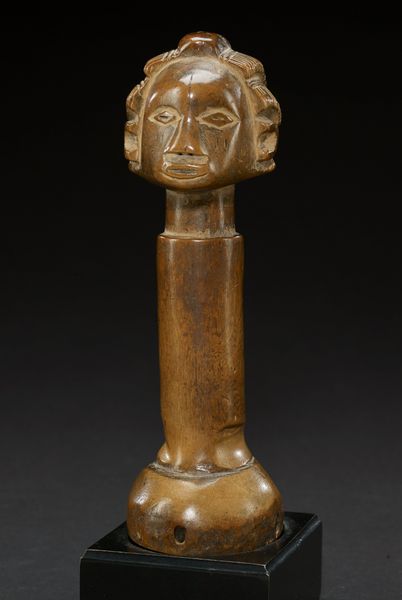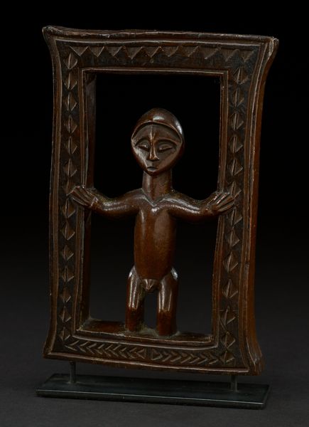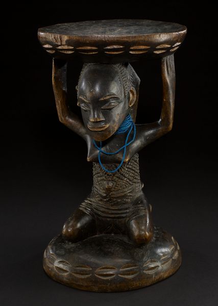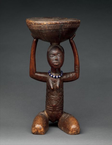 Curator: Here we have a wooden stool, likely from the 20th century, crafted by the Luba people. It is currently held in the collection of the Minneapolis Institute of Art. What are your first thoughts on this intriguing piece? Editor: Immediately, I'm struck by the stillness it exudes, that sense of silent strength, so evocative. The figure kneeling there... burdened yet serene, timeless, even. I see both beauty and utility interwoven. Curator: Yes, Luba stools like these were not merely functional objects. They were sacred items, symbols of kingship, with each ruler receiving a new one at their inauguration. The female figure, her identity forever linked to that ruler, served as a vital cultural symbol. Editor: The choice of the female figure intrigues me. It almost seems to speak to ideas around labor and power. Was there something specific about female imagery in Luba culture that elevated them in a such a significant ceremonial and hierarchical manner? Curator: Absolutely. In Luba cosmology, women were associated with lineage and the transmission of power. These stools, therefore, visually represent the continuity of royal authority through the female line, invoking ancestral connections and maternal power. The intricate scarification patterns also carry symbolic meanings relating to status and beauty ideals. Editor: Those scarification patterns – they’re so meticulously carved. Almost like the wood becomes a canvas bearing witness to complex social narratives and aspirations. It also has something of an erotic element, but in very subtle ways. How much can we truly decode these symbols given the distances, temporal and cultural, involved in encountering this piece today? Curator: Deciphering these symbols can be complex. But beyond specific interpretations, their presence emphasizes the importance of coded communication within Luba society. It's also crucial to avoid simply reducing everything to simple functions, as modern colonial taxonomies did in the past, often ignoring the religious meanings imbedded within so-called "useful" tools and things. Editor: A critical reminder for us, indeed. This stool then becomes not just a piece of furniture, but a potent symbol of governance, lineage, and cultural memory, powerfully embodied in a form both practical and sacred. I'll be spending more time examining Luba uses of this archetypal form and symbol of womanhood, for certain. Curator: Likewise, I will consider its emotional resonance across cultures and historical shifts, from its role in the enthronement ceremonies of a Luba King to its status today as an esteemed object within the walls of the Minneapolis Institute of Art.