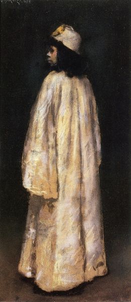 Editor: Here we have James Abbott McNeill Whistler's "The Little Red Cap," an oil painting from 1899. The figure seems to almost melt into the background. It's... evocative, but I'm not entirely sure what to make of it. How do you interpret this work? Curator: This piece whispers to us, doesn't it? Whistler was deeply invested in evoking a mood through colour and form. Notice how the figure is rendered—almost a memory or a dream. What symbolic weight does this ephemeral treatment carry, do you think? Editor: Maybe it's about the fleeting nature of youth and beauty? The model's partially nude, shrouded yet revealed... a tension there? Curator: Precisely! The "red cap," although barely visible, hints at vibrancy and life, contrasting with the muted tones and fading form. Whistler uses this symbol to ignite cultural memory. He's not just painting a body; he’s painting an experience, filtered through the gauze of time and suggestion. Does it remind you of something? Editor: Sort of like classical sculptures that we only know through fragments now, and we imagine the whole? Curator: Good eye! This piece invites us to complete the image in our minds, tapping into our collective understanding of beauty, mortality, and artistic legacy. It reflects our memory and ideas of youth more than reality itself. Editor: I never considered how the fading effect engages the viewer so directly, making us almost active participants in completing the story. Thank you. Curator: It is indeed a dialogue, isn’t it? Art inviting us to converse across time and personal experience.