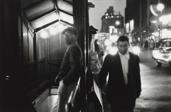 Ted Croner made this photograph, *Cafeteria, New York City*, at an undetermined date. Croner was part of the New York School of photographers in the 1940s and 50s. His atmospheric black and white images captured the energy of urban life, particularly at night. Here, we see a man in a pinstripe suit and fedora, an outfit which speaks to a particular vision of mid-century masculinity. However, the soft focus and grainy texture undermine any straightforward sense of self-assurance. This aesthetic captures a sense of postwar alienation, the tension between the promise of prosperity and the undercurrent of anxiety. The blurred figure in the background adds to this feeling of unease. It’s as if the city's frenetic pace is intruding on a moment of private reflection. Croner’s lens transforms the everyday into a scene of cinematic mystery. He finds beauty in the ephemeral, inviting us to contemplate the hidden stories within the urban landscape.