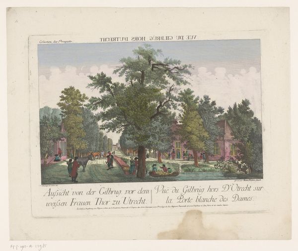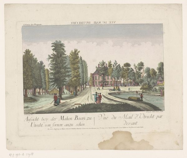 Curator: Alright, let’s talk about this delightful scene. We're looking at "Gezicht op de Maliebaan te Utrecht," or "View of the Maliebaan in Utrecht," rendered in a print sometime between 1755 and 1779. The details are achieved through the technique of engraving, now residing in the Rijksmuseum collection. Editor: Ah, yes. My first impression is this feels meticulously staged. The converging lines draw me in like a forced perspective trick on a theater set. There's a dreamlike quality, softened by delicate watercolors—a rosy escapism, I'd say! Curator: I agree! Notice how the strong lines of the baroque style help structure the idyllic vista. The way the avenue narrows in the distance showcases a real mastery of perspective, creating that sense of depth. And yes, it's all rather idealized; life, but make it Rococo! Editor: Speaking of Rococo, the little figures seem so preoccupied, they hardly register in this constructed paradise. Do you think that detachment speaks to anything specific about the artist or maybe about life during this era? There is some delightful detail to note too... A little splash of pink on a building to the left and again, like an echo, on a building toward the center line, where one carriage travels and where a gathering of people share something in the sunshine! Curator: Hmm, fascinating. The artist places the common citizen into a much larger story of town design, almost unimportant at this scale but adding texture and activity, like punctuation in a longer novel. Their leisurely pace along the Maliebaan offers, to me, a picture of societal values focused on appearances of order, but it's undeniably soothing. Editor: Order maybe, but within this framework I sense that a kind of stillness prevails—as if one moment is being held indefinitely in aspic. Curator: True. In this stillness we gain more opportunity to appreciate its charm. I've enjoyed noticing new facets in a picture I already had great respect for. Editor: Agreed. A perfectly delightful jaunt down a well-ordered street!