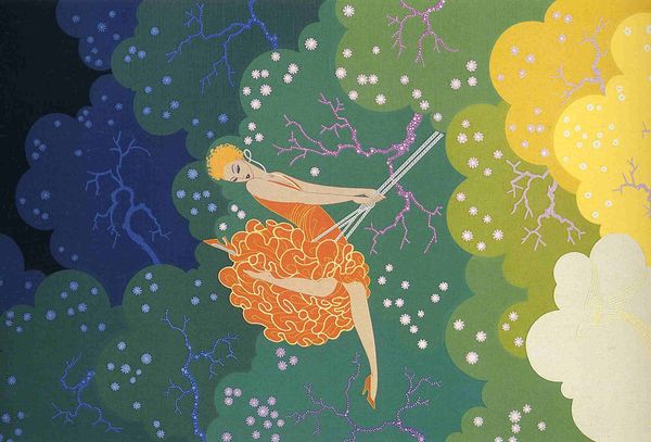 Editor: So, here we have "The Seasons, Spring" by Erte. It's incredibly decorative; the lines are so clean, and the colours pop. But, something about it feels...almost theatrical. What strikes you when you look at this piece? Curator: Theatrical is the perfect word! For me, it's about transformation, isn't it? Like shedding the skin of winter, birthing that lightness through these elegant lines. See how Erte uses colour blocking, that strong contrast, almost a push and pull? I'm curious, what's your immediate sense of Spring in the piece? Editor: I notice this tension you mention, with the dark and the bright competing for space. It’s spring, so I want it all light, but that shadowy mass overpowers everything, but this single bird breaks through. Curator: Precisely! The bird, the promise, that delicate flutter amidst the bold abstraction. Is it a sense of hope battling against... something heavier, perhaps? Spring isn't always sweetness and light, and I think Erte captures that complexity with such deceptively simple forms. Editor: It makes me wonder if that contrast between dark and light is there to represent life, or if the shapes even work as a body; everything inside is beautiful spring, while outside it is winter’s passing. Curator: A body, a vessel! I hadn't quite seen it that way. Erte played with such layers of meaning, so hidden sometimes within all of this stylish Art Nouveau decoration, it's good that we can still appreciate such complexities today. Editor: I appreciate how Erte uses bold visual strategies to get his vision of Spring across, using simplicity of form. I hadn’t considered it this way before, I am eager to know more about Art Deco! Curator: And I, seeing your connection, realize I must reconsider what Erte communicates of rebirth with so much sophistication. A true awakening of understanding on both ends.