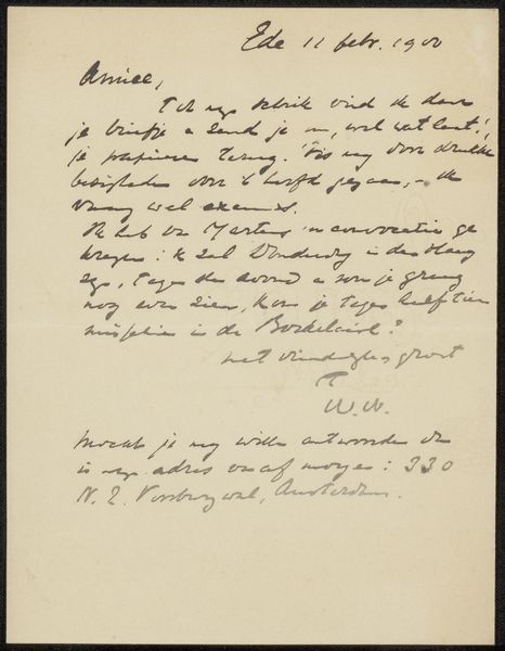 This letter to Philip Zilcken, made by W.J.G. van Meurs, is all about the process, right? You see how the ink kinda pools in places, the pressure of the nib varies, and the whole thing has a forward momentum. You can tell he’s really thinking as he’s writing, almost like sketching in real-time. I love the materiality of this piece. You can almost feel the paper, it seems quite thin, and the ink is a lovely dark brown. I’m struck by the way the text cascades down the page. It's not perfectly even or spaced, which brings a lovely, relaxed rhythm to the page, almost like a musical score. And then there's that signature, with a flourish of the 'W' and the confident 'Meurs' beneath. This reminds me a little of Cy Twombly's scrawled paintings, where the act of writing becomes a form of drawing, and the message is as much in the gesture as in the words themselves. Art's like a big conversation, always echoing and riffing on what came before. It’s a reminder that art isn't about answers, it’s about the questions we ask along the way.