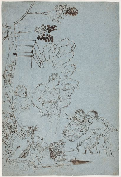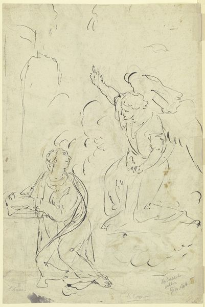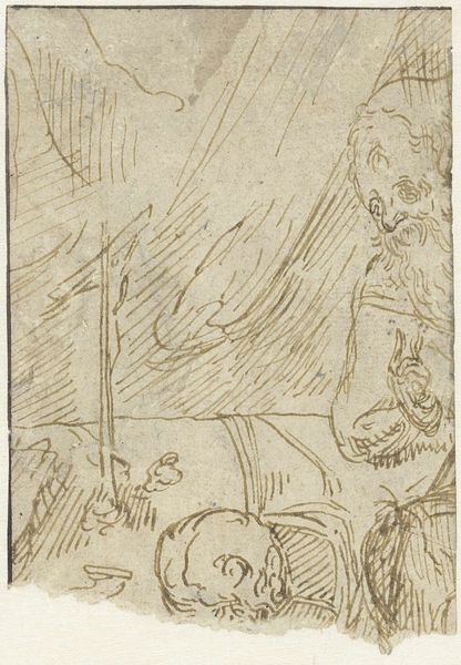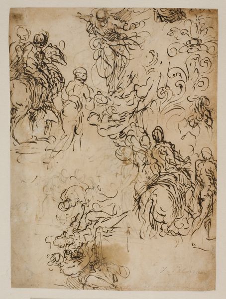 Curator: Thomas Stothard’s "Sketch of Figure Leaning on Cane" presents a wonderful glimpse into the artist’s process. The artwork is undated and rendered in ink on paper. Editor: The frantic linework immediately captures my attention. It’s a very evocative piece. There's an almost anxious energy in those scribbled lines, despite the static pose. Curator: Exactly! It prompts us to think about the economic realities surrounding art production during Stothard's time. Pen and ink sketches like these weren't just preparation; they often served a crucial role in disseminating imagery to a broader audience via printmaking. Stothard produced illustrations for books, tickets, and pamphlets and many other ephemeral material, and drawing served as an important stage for his image production and distribution. Editor: From a formal perspective, notice how the artist uses contrasting densities of line to create form and depth. The figure is relatively well-defined while the surroundings are almost abstract. The composition is a study of contrasts, hard and soft, clear and implied. Curator: We should also consider the figure themselves. The cane suggests something about social status, maybe leisure or perhaps the necessity of the cane. It becomes quite telling about 19th century societal norms. Editor: Agreed. But I wonder if the material choices are contributing to the atmosphere? The very quick and light marks convey, from a visual point of view, a feeling of lightness, something perhaps felt by a passer-by during a transient moment. Curator: Certainly. By emphasizing the materials and production processes of what were usually perceived as informal drawings, we reveal a more complete picture of both the art and the context for these pieces of work. It provides evidence to reveal an industry, an industry of art reproduction in the 19th Century, through which the popular images emerged that impacted material culture and perception for the world. Editor: In essence, Stothard transforms simple lines and readily available materials into an incredibly thought-provoking experience. Curator: Absolutely, this sketch acts as an example of art creation responding to production demands and the social conditions. It highlights both function and beauty. Editor: A remarkable work of both skillful artistry and intriguing insight.
