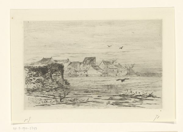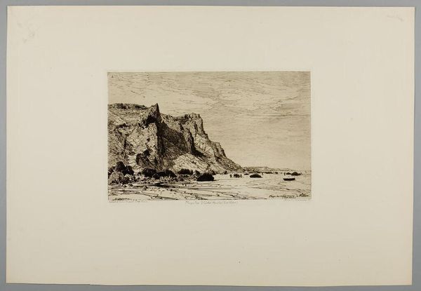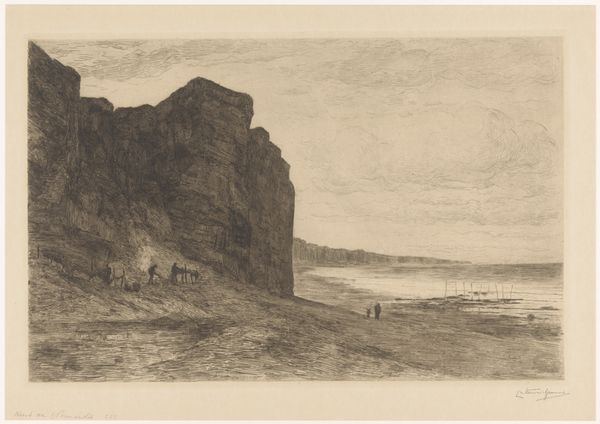 Carel Nicolaas Storm van 's-Gravesande created this print titled "Rotsblokken bij Veules." The subdued monochromatic palette immediately evokes a somber mood, emphasizing the rugged, natural forms depicted. The composition is structured around a series of massive rocks in the foreground, contrasted by the looming cliff face on the right. The artist uses line and texture to convey the geological features, giving them a tactile quality. The sky, rendered with a light, hazy wash, creates a sense of depth and envelops the scene in a muted atmosphere. The arrangement of rocks and cliffs suggests a dynamic interplay between permanence and transience, inviting reflection on the elemental forces shaping our world. The scale of the rocks and cliffs dwarf other landscape features to create a feeling of awe.