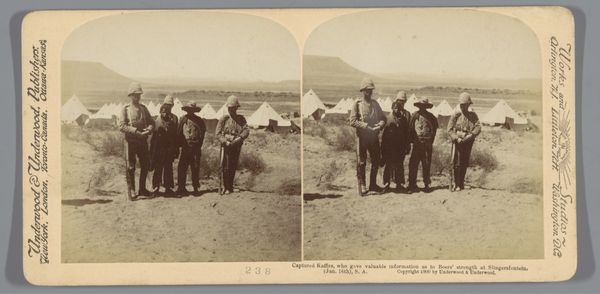 Curator: Immediately, I see a powerful visual statement of imperial authority—British soldiers, mounted, in what appears to be South Africa. Editor: There's a stillness to it. A slightly bleached, desolate landscape, yet the soldiers are posed so formally, like statues. The light has such a nostalgic feel. Curator: Indeed. This gelatin-silver print, whose authorship remains anonymous, is titled “British soldiers on horseback in Rensburg, South Africa,” and its date has been tentatively placed somewhere between 1900 and 1930. We should keep in mind the British presence in South Africa and the Anglo-Boer War, which ended in 1902. I believe this photographic image needs to be seen in context with the larger political motives of the time. Editor: It does strike me how upright they are, even rigid. Military men become like emblems of a cause, or instruments of larger ideologies. Their bearing, the horses themselves, their presence in that specific landscape... all create a potent symbol. The horses project such grace, even subservience; are they meant to further legitimize British control and supremacy? Curator: Perhaps, although realism, in photographs of war, offered very subtle critiques of authority at the time. The details would become the subject, shifting it slightly from authority to a study of people under authority, in conflict. Editor: I notice how closely packed they are. Perhaps this grouping itself signifies unity and might in a foreign landscape. Almost like a show of power and confidence, of unyielding military bearing and colonial domination. It's really fascinating how a still image can convey so much underlying tension, historical complexities, and maybe some propagandist intention. Curator: Right, these seemingly simple images can often speak volumes about broader power structures and cultural attitudes of their time, prompting a lot of thought for contemporary audiences, especially as we consider legacy. Editor: Yes, indeed, an enduring symbol evoking reflection on history's lasting impact.