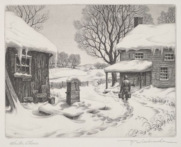 Kerr Eby made "Still Hollow" as an etching, and right away you can tell he's super into the nitty-gritty of mark-making. The whole scene is rendered in this intricate network of lines, like a million tiny scratches building up this snowy landscape. The way he layers those lines to create depth and shadow is really something, it gives the scene a kind of tactile quality. Look closely at the rooftops; you can almost feel the weight of the snow, and the stark contrast with the bare trees adds a stark kind of beauty. It reminds me a little of Whistler, who was also a printmaker. But where Whistler goes for atmosphere, Eby seems more interested in structure, in really mapping out the space. Ultimately, it’s all about how artists see the world, and how they translate that vision into something we can all experience.