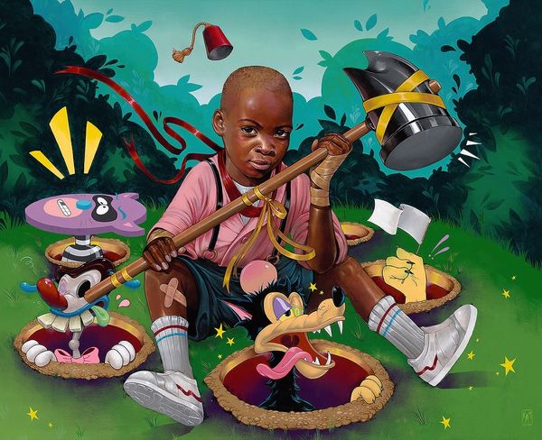 Kayla Mahaffey made this eye-catching image, Once Forgotten, Now Remembered, sometime in the 20th century, probably using acrylics or oils on canvas. The colors are rich and the brushwork looks smooth. You can tell she took her time layering to get those tones and textures. There's a sort of dream-like quality to the way she mixes realistic figures with cartoonish elements, kind of like a vibrant memory. Just look at the pick in the boy’s hand, each comb is precisely painted and layered with contrasting shades to create texture and depth. Mahaffey’s combination of contemporary portraiture with surreal imagery reminds me a little bit of Kerry James Marshall, where historical and cultural references meet personal narratives. Like all good art, this piece leaves you with questions, not answers, so enjoy puzzling it out.
