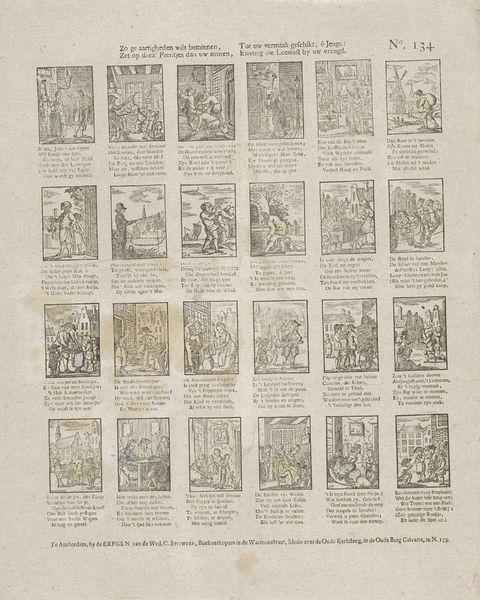 This undated print, made by Jacobus Thompson, presents sixteen vignettes of Turkish men and women arranged in a grid. The monochromatic palette and the stark contrast between the figures and the background create a dramatic visual effect. The lines are precise, almost mechanical, giving the scenes a sense of order and control. The composition invites a structuralist reading, reducing individuals to types within a cultural framework. The grid itself acts as a semiotic structure, categorizing and defining the ‘Turksche mannen, Turksche vrouwen’ for the Dutch viewer. Each scene, framed and contained, presents a narrative snapshot, yet the lack of context leaves them open to interpretation, shaped by the viewer’s preconceived notions. Consider how this formal arrangement challenges fixed meanings, inviting us to question the power dynamics inherent in representation and the construction of cultural identity. The rigorous lines and structured layout offer a glimpse into the mindset of a period grappling with encounters with the ‘Other,’ framed not just aesthetically but also as part of a larger cultural discourse on identity and representation.