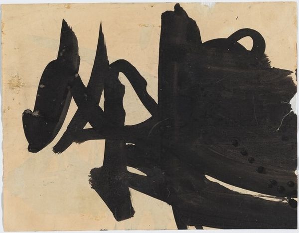 Curator: Looking at David Smith’s “Don Quixote” from 1952, I'm struck by its restless energy. It's a linocut print, all sharp angles and heavy black ink—chaotic, almost. What do you make of it? Editor: Chaotic is a great word. But looking closely, the rough-hewn quality suggests a very physical, labored process. Linocut isn't exactly known for subtlety; it’s demanding, repetitive. I imagine Smith really wrestling with the material here. Curator: I feel like the abstraction hints at Don Quixote’s fractured mental state, lost in his own fantasies. The crude, bold strokes become visual metaphors for his misguided bravery, a distortion of reality. Does that make sense? Editor: Absolutely, the "means" here amplifies its thematic resonance! It wasn't like he was sitting at a desk drafting out sketches. No, with this type of labor, you commit directly to an image, carving it into the lino. One cut at a time... Curator: There's a raw immediacy to that. It makes me think of Smith, channeling Quixote's impetuousness, driven by his creative passions— perhaps jousting with the printmaking process itself? What you get as a result of labor are raw materials transformed through strenuous artistic efforts. Editor: And it matters where this image gets seen and distributed; the prints allowed him a relatively easy mode of production and circulation, bringing this character of quixote outside traditional artistic places. Curator: It seems to bridge abstraction and figuration; the mechanical looking bits resemble both cogs and organic matter intertwined, almost representing his conflict between dreaming and waking reality. Editor: Yes, a critical viewpoint to highlight that his creative endeavor is not without social context; the print makes Don Quixote, a product for us, within society. Curator: Exactly. Ultimately, it distills Don Quixote to something visceral and turbulent, a stark visual poem rather than a literal depiction. It stays with you, this raw emotion… Editor: The rawness sticks with you. Looking at Smith grapple with his own medium, you know what I mean? His actions give material shape to intangible cultural figures, bringing labor and historical icon together.