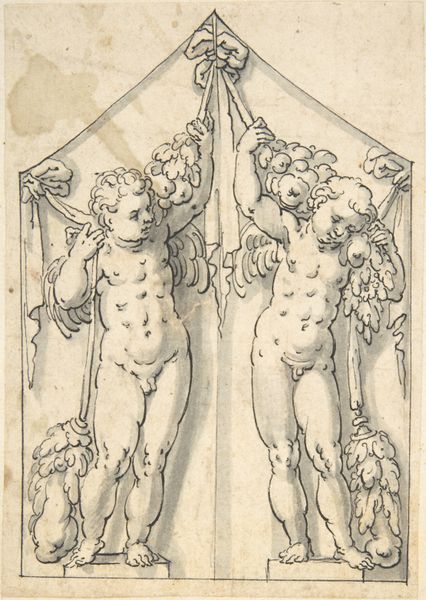 Giovanni Battista Foggini made this pen and brown wash drawing of a satyr and satyress to design a sculpture. The figures, rendered in intricate detail, are captured amidst a play of light and shadow that animates the scene with Baroque dynamism. The composition is structured around a central vertical axis, where the figures bear the weight of an ornate vase. Their forms exhibit a certain tension. Foggini's use of line creates a sense of movement, particularly in the flowing hair and musculature of the satyrs, and in the decorative flourishes of the pedestal. Note how the artist's emphasis on musculature and expressive poses reflects an engagement with classical ideals, transformed through a Baroque sensibility. The drawing can be seen as an attempt to merge classical mythological subjects with the exuberance and drama characteristic of Baroque aesthetics, challenging the viewer to reconsider the boundaries between the sacred and the profane.